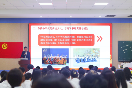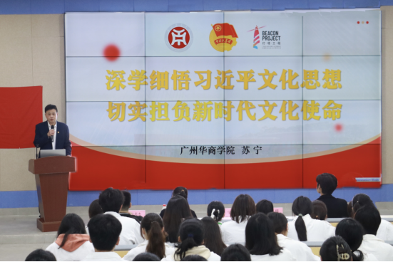 苏宁书记的授课深入浅出,既有理论的高度,又有实践的深度,为同学们更好地在践行文化自信,服务“国之大者”和“省之大计”、推进学校高质量发展中找准自己的青春定位提供了重要指引。他以习近平总书记对宣传思想文化工作作出的重要指示为切入点,围绕宣传思想文化工作的重要意义、任务等方面,为华商学子深刻解读了党的创新理论。随后,他以鲜活的校园故事、精彩瞬间,带领同学们深刻感悟习近平文化思想凝心铸魂、领航掌舵的实践伟力,引导学生勇担时代责任和新的文化使命,以自身的实际行动传承和弘扬中华优秀传统文化。