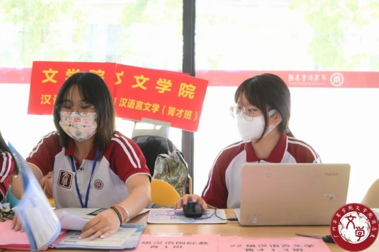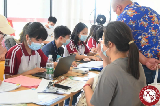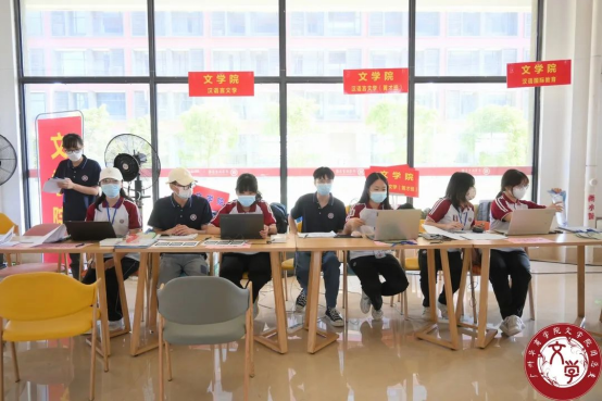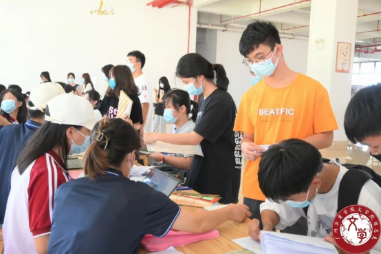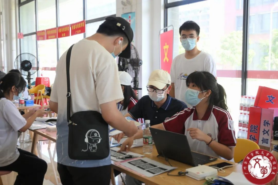 注册结束后,志愿者为新生贴上带有文学院院徽臂章贴纸,发放文学院团总支以及学生会的招新宣传单、为新生递上定制扇子,注册工作全程井然有序,展现出驻营老师和志愿者们的热心、细心、耐心,呈现出华商学子的良好风貌。