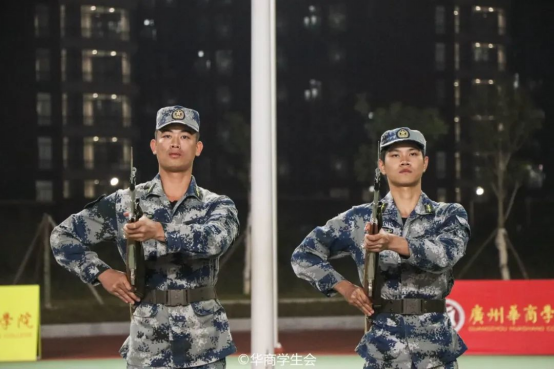 在广东省国旗护卫队总指导王念江同志的口令下达后,教官黎展荣、林沛哲同志为同学们进行了连贯步伐持枪动作的精彩展示,他们步伐坚定、动作精准、声音浑厚、飒爽英姿,展示了国旗护卫队“护我国旗,壮我国威”的精神风貌。