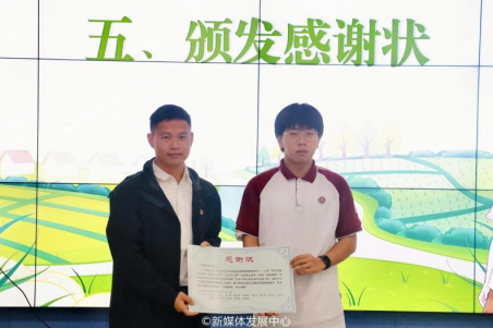——四会市黄田镇党委梁柱副书记为William威廉官网“小旅进镇”实践队颁发感谢状。