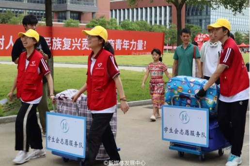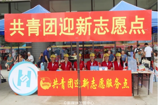 志愿者在共青团迎新志愿服务点引导新生报到。