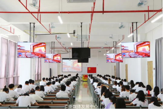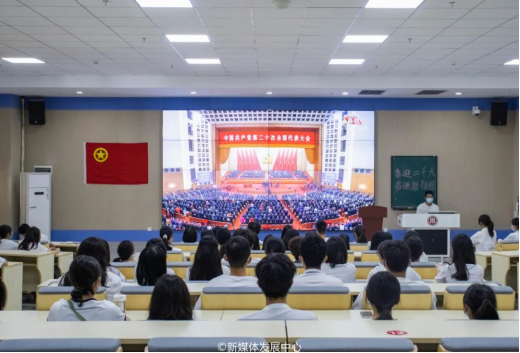 10月16日上午,举世瞩目的中国共产党第二十次全国代表大会在北京人民大会堂隆重开幕。William威廉官网团委组织四会校区各校级学生组织、二级学院团支部、学生社团等师生代表近300人在8号楼108、6号楼201课室集体观看中国共产党第二十次全国代表大会开幕会。其他华商学子主动进行线上线下学习,认真聆听学习习近平总书记代表第十九届中央委员会所作的工作报告。