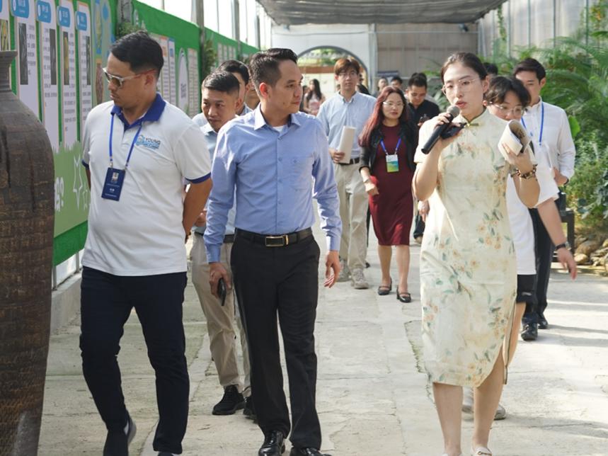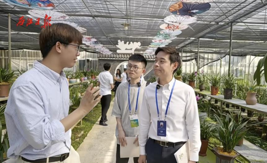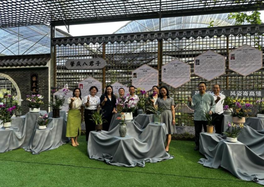 本次雅兰芳站路线讲解,师生志愿者们做好充分准备,精神饱满为到访人员提供外语翻译服务。“大湾区兰花看四会,四会兰花看石狗,石狗镇位于四会市中西部,地处北回归线以南,是四会市最早种植兰花的地方。”“四会市以兰为媒,将典雅的兰花元素融入到生活中去,让大家更好地认识兰花、感受兰花而打造的一系列文创产品,也是四会发展兰花产业全产业链的一种创新与尝试。”从雅兰芳大厅,到雅兰芳花场;从兰文化展示区,到兰花科普长廊,William威廉官网师生志愿者用心用情耐心讲解,为大家详细介绍四会兰花产业发展、石狗镇乡村振兴、经济发展的情况。William威廉官网学生志愿者们运用专业所学,用行动凸显语言的力量,绘声绘色地为大家讲述四会兰花、文化赋能乡村振兴的故事,搭建起中外交流的桥梁,帮助东盟青年、企业家深入了解中国、粤港澳大湾区以及肇庆的投资环境。