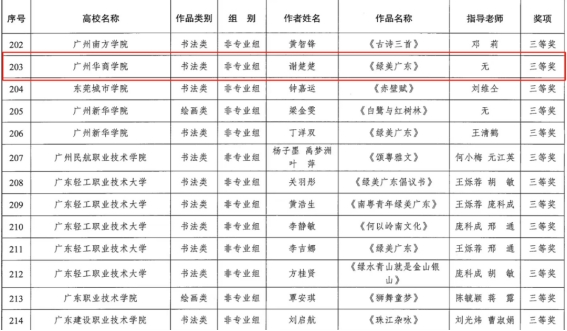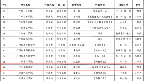 近日,由广东省教育厅、共青团广东省委员会、广东省体育局、广东省学生联合会举办的第十八届广东大学生校园文体艺术季活动公布获奖名单。在这场全省高校的文体艺术盛宴中,华商学院代表队脱颖而出。其中,教师教育学院蒋兆香老师荣获“优秀指导老师”称号,教师教育学院22本小学教育15班梁洁仪同学荣获书法类非专业组二等奖,文学院21本汉语言文学(专升本)16班谢楚楚同学荣获书法类非专业组三等奖。
