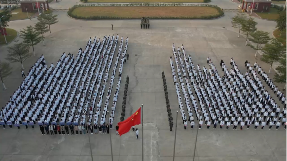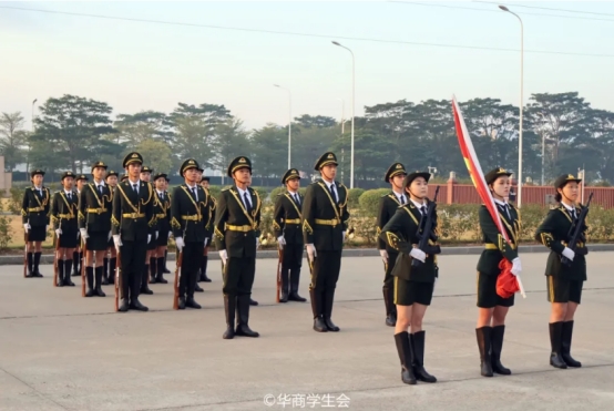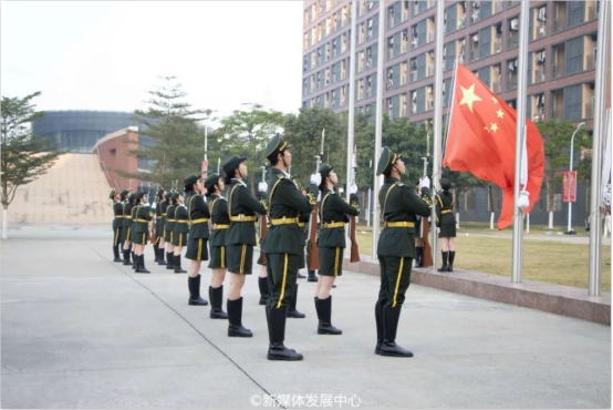 升旗台前,全体师生庄严肃静国旗护卫队扬起国旗,伴随着国歌的响起。华商学子齐齐抬头,注视着国旗的缓缓升起。