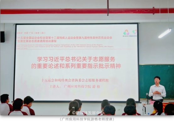 4月19日,在肇庆校区16号楼104,广州应用科技学院游格老师以《学习习近平总书记关于志愿服务的重要论述和系列重要指示批示精神》为题,深入解读习近平总书记对志愿服务工作的战略指引与深切关怀,强调青年志愿者应立足时代使命,将服务实践与国家发展同频共振。