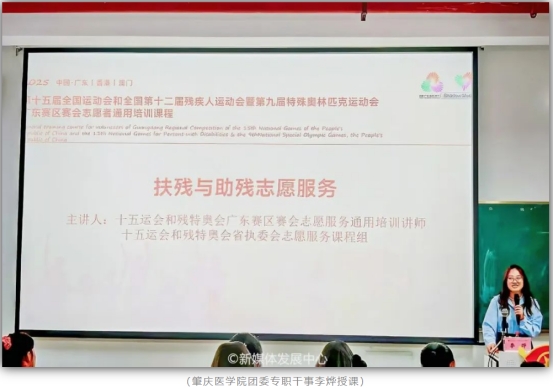4月22日,在肇庆校区16号楼104,肇庆医学院团委专职干事李烨以《扶残助残志愿服务》为主题对志愿者们展开培训,强调要以平等尊重的态度服务残障人士,掌握专业助残技能,用耐心和爱心传递社会温暖。培训通过案例讲解帮助志愿者提升助残服务能力。