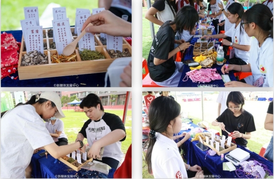 香囊制作体验区的活动桌面摆满了各式各样的香囊和本草香料。同学们纷纷挑选自己喜欢的香囊,开始动手制作属于自己的本草香囊。在填充香料的过程中,大家根据工作人员的建议,按照不同的功效和配方,仔细地调配着各种本草的比例。有的香囊主打提神醒脑,以薄荷、丁香为主料;有的侧重于驱蚊防虫,加入了大量的艾叶和菖蒲;还有的则注重安神助眠,选用了薰衣草、陈皮等本草。每一个香囊都承载着大家对健康的美好期许,凝聚着大家的巧思与匠心。