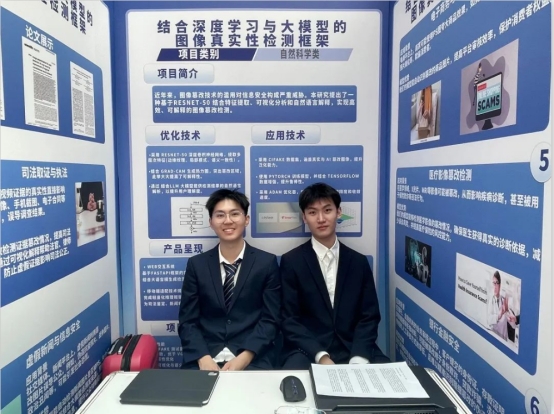 项目负责人:唐贤祎,项目成员:李宇凡,刘玉灵,林成皓,指导老师:王怡时,霍永良,许丽娟,项目概况:随着生成对抗网络与扩散模型的快速迭代,高度逼真的图像伪造技术加剧了虚假信息传播风险,对社会信任机制构成严峻挑战。本项目针对生成式模型滥用导致的图像篡改问题,构建了一套基于深度学习和大型语言模型(LLM)的创新性图像真实性检测框架。通过深度融合ResNet-50网络的多层级特征提取能力与Grad-CAM可视化技术,模型不仅能精准识别生成式AI的篡改痕迹,还可通过热力图直观定位可疑区域,破解传统检测模型的“黑箱”困境。在此基础上,项目进一步引入LLM对检测结果进行语义解析,将技术性特征转化为自然语言描述,自动生成包含篡改手法推断、异常区域详情的分析报告,大幅降低非专业用户的理解门槛。实验验证显示,该框架在CIFAKE数据集上的准确率与F1分数均突破96%,显著优于主流基线模型,同时其热力图与LLM的协同分析功能在新闻核查、司法鉴定等场景中展现出高效的应用价值。作为技术亮点,项目首次将视觉可解释性与语义推理能力整合至检测流程。