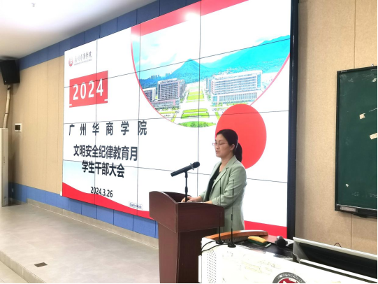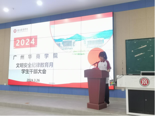 接着,学生干部代表赖楚怡同学代表全体学生骨干发言,向大家提出了两点倡议:一是全体学生骨干应做到知行合一,以知促行,以行求知。二是全体学生骨干应牢记以身作则,厚植文明纪律理念,形成共生效应。应自觉遵守校规校纪,严格要求自己的言行举止,秉持正确的价值观,做一个讲文明、守纪律、有道德素养的华商青年。