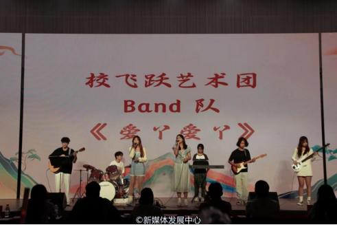 ——中场表演。校飞跃艺术团Band队带来歌曲《爱丫爱丫》,活跃了全场气氛,将王牌MC主持人大赛推向高潮。