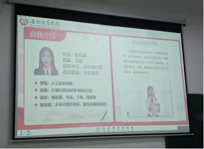 彭怡美,女,中共党员,来自人工智能学院21级计算机科学与技术3班。现担任班级班长,曾任人工智能学院学生党建工委委员、学院学生第一党支部纪委、学院团委委员、学院团委青协分会负责人、西9栋临时党支部纪委、学院主持队工作人员等。