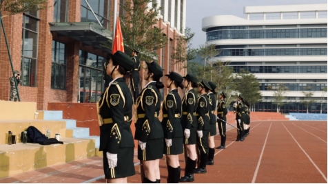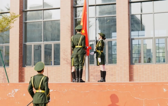 当清晨的第一缕阳光洒在军训场上,同学们早已整齐列队,等待着神圣的升旗仪式。国旗护卫队迈着整齐有力的步伐,护送着鲜艳的五星红旗走向升旗台。他们的每一个动作都充满力量,每一步都坚定无比。