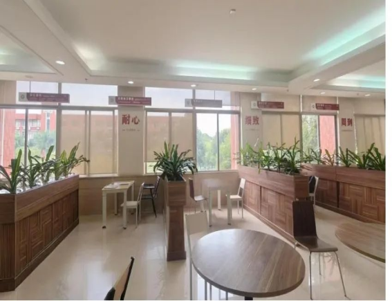 大厅内专门设置了宽敞的等候区域,摆放着许多整齐有序的桌子和椅子,营造出舒适的等待环境。当同学们办理业务需要排队等待时,不必再站着干等,可惬意地坐在桌前休息。这提升了办事效率,也为大家提供了便捷又贴心的服务体验,尽显人性化关怀。