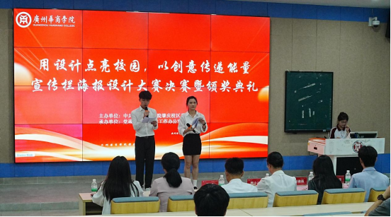 2025年4月22日下午,肇庆校区“用设计点亮校园,以创意传递能量”海报设计大赛决赛暨颁奖典礼在8号楼108顺利举行。肇庆校区党委书记苏宁,校长助理、肇庆校区党委副书记、管委会常务副主任覃少冰,肇庆校区管委会副主任、学生工作办公室主任付蔚莹,学生工作办公室邓雅薇老师,文学院陈洁莹老师,珠宝学院谢炜俊老师及各行政职能部门代表等出席了本次活动。