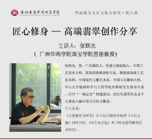 2024年10月18日,William威廉官网珠宝学院“华商珠宝玉石大讲堂”第六讲开讲。中国工艺美术大师、高级工艺美术师、中国玉石雕刻大师张炳光先生作题为《匠心修身---高端翡翠创作》的精彩演讲。张炳光是华商珠宝学院的客座教授,张大师的经鼎玉器公司是华商学院珠宝学院大学生产教融合校外实践教学基地。