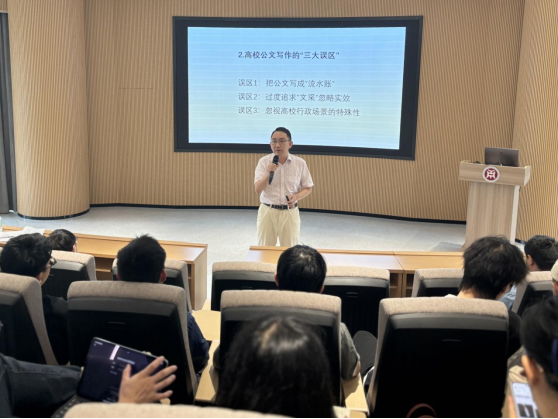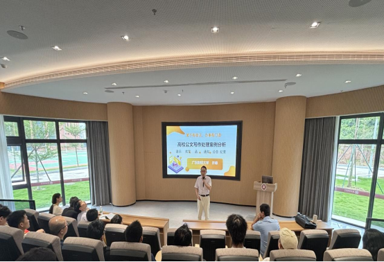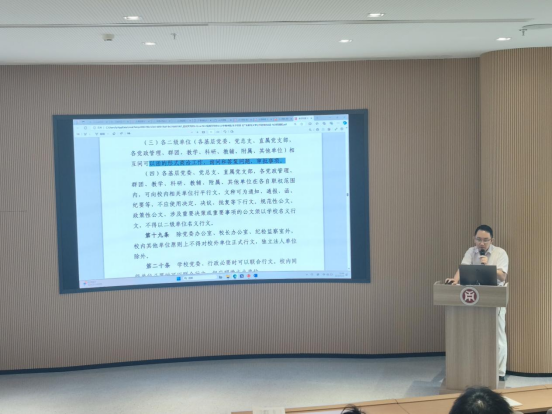 培训中,广东财经大学许峰副教授以“高校公文写作处理案例分析”为主题,深入讲解了报告、请示等上行文在工作中的正确使用要点及注意事项,对相应文件的体系、位阶与效力进行了概述,并就相关常见问题展开阐述。